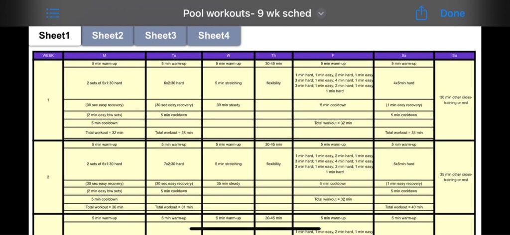 If you are in an injury cycle right now, sharing a pool running plan below that I’ve used in the past when I was weeks out from a marathon and hit with ITband syndrome to the point I couldn’t walk. Using this plan***, I was able to not only get to the start line as planned, but also finish the full 26.2 that season!
